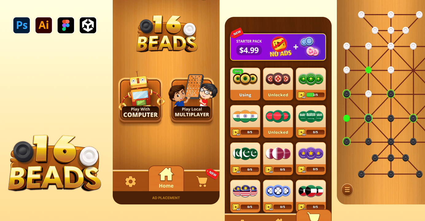 Led UI/UX design, game design, and technical implementation for 16 Beads (Sholo Guti) Classic. Recreated the traditional board game experience with modern visuals and seamless gameplay using Adobe Photoshop, Figma, and Unity.